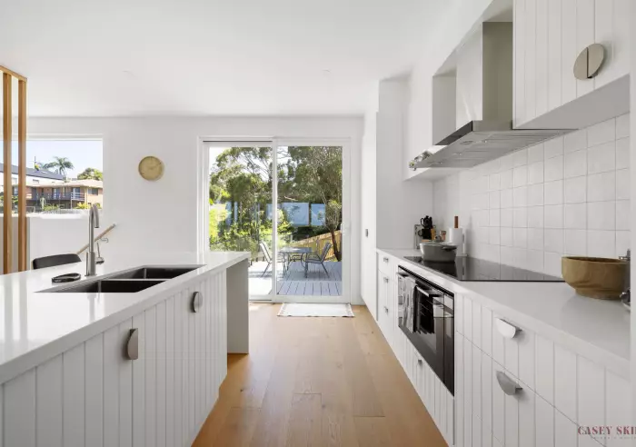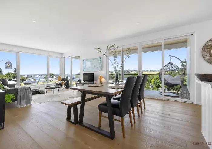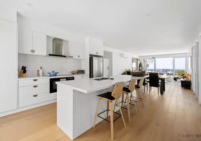 Stone finishes anchor the statement kitchen, while engineered timber floors flow through open living spaces that connect seamlessly to two private decks. Three spacious bedrooms all capture the scenery, while a separate study and cleverly zoned layout make the home as functional as it is striking.