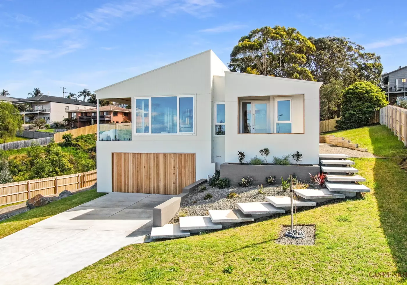 Architectural flair and natural beauty come together in this brand-new split-level home on 828m² (approx.). With an abundance of indoor and outdoor living, it's designed for comfort, style, and sweeping views across Bass Strait, the North Arm and bush reserve.