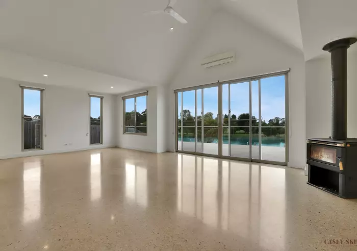 Constructed with durable Hebel Power Panels, the home reveals polished concrete floors and a striking kitchen with 900mm gas cooktop, sleek appliances, concrete benchtops, and a walk-in pantry. The light-filled lounge features a raked ceiling, fireplace, and split system, opening via double doors to a spacious entertaining deck with glass balustrade. Additional outdoor pleasures include a BBQ patio and beautiful water views enjoyed from inside and out the home.