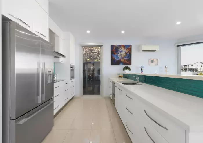 On the ground floor, the master suite opens to a sun-drenched private courtyard with calming canal views. Two further bedrooms, a central bathroom, and a study sit alongside a spacious double garage offering room for two vehicles, a motorbike, and a practical workshop area with sink. The open-plan kitchen, dining, and living areas are defined by a wall of windows framing the striking water outlook, flowing seamlessly to an expansive deck and landscaping down to the canal's edge. Comfort is ensured year-round with multiple split-system units, ceiling fans, and double-glazed windows.