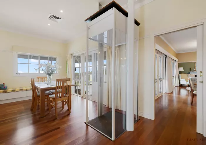 From the moment you arrive, soaring 10-foot ceilings, ornate cornices and ceiling roses, and rich Tiwi hardwood floors create an immediate sense of warmth and quality. Multiple living and lounge zones are thoughtfully arranged across both levels, enhanced by feature fireplaces, central heating and cooling, and the convenience of internal lift access. The expansive wrap-around verandahs and north-facing living areas invite seamless indoor-outdoor entertaining, with elevated views across the surrounding landscape to the lake system and out toward the ocean, a stunning backdrop enjoyed from multiple vantage points.