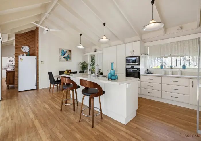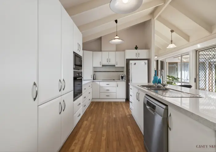 The granite-benched kitchen offers generous storage and connects seamlessly to two light-filled living zones, both enjoying the outlook and enhanced by soaring cathedral ceilings. Updated bathrooms and a dedicated dining area add to the home's timeless appeal.