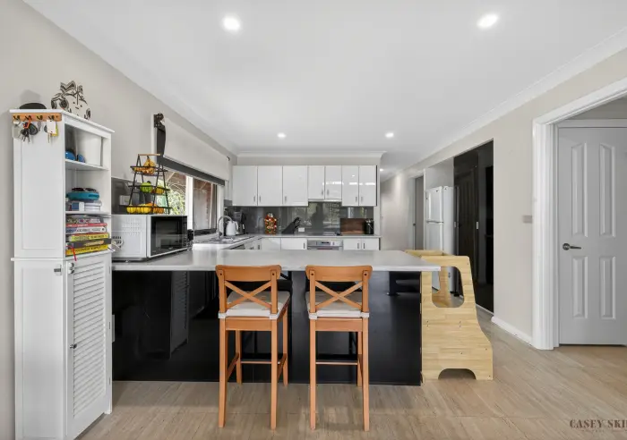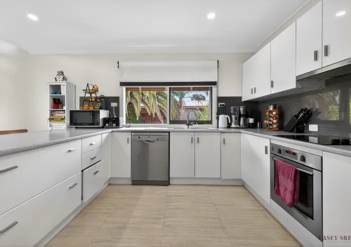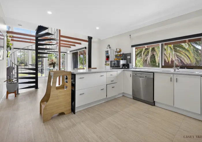 The home's distinctive A-frame design is complemented by expansive windows, filling the open-plan kitchen, dining and living area with natural light and creating a warm, welcoming atmosphere throughout the day. The kitchen is functional and family-friendly, featuring electric cooking, dishwasher, generous storage and a breakfast bar that naturally becomes a central gathering point.